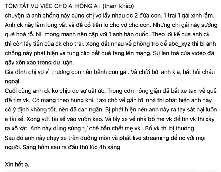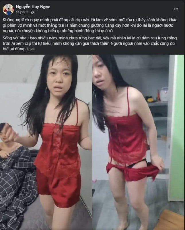 Theo nội dung bài đăng đi kèm, người này cho biết đã phát hiện vợ mình có hành vi không chung thủy với 1 người Trung Quốc. Sự việc được cho là xảy ra vào buổi sáng khi người chồng đi làm về sớm và bắt gặp tình huống ngoài mong muốn. Trong trạng thái bức xúc, người này đã quay lại hình ảnh tại hiện trường và đăng tải lên mạng xã hội.
