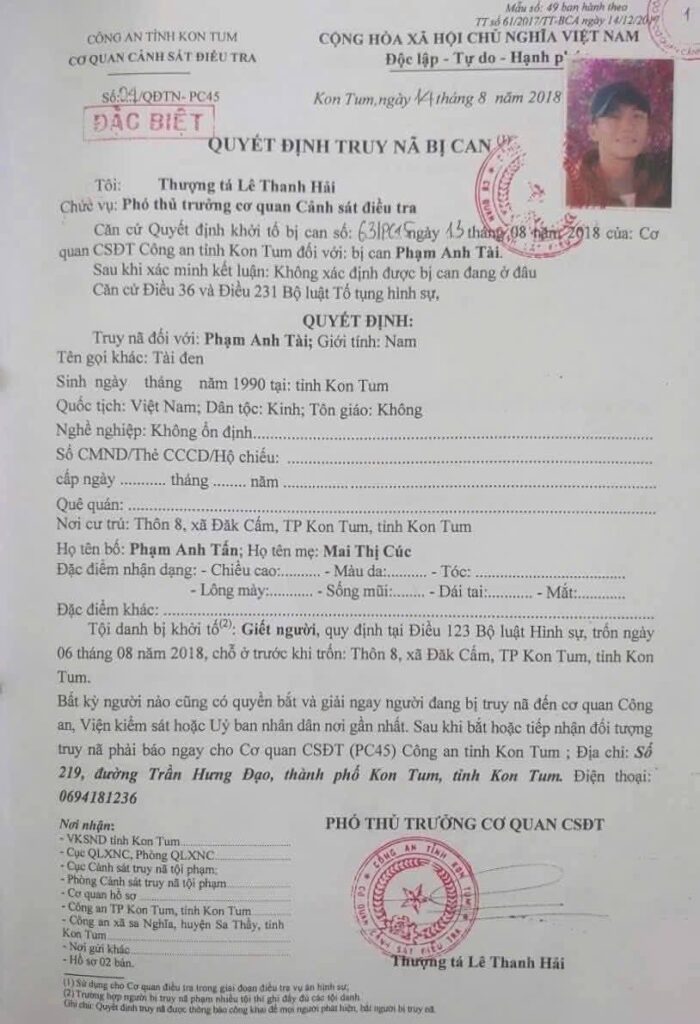 Bước đầu xác định 2 nghi phạm này tên Â. và T. Trong đó T. còn khai nhận có liên quan đến vụ hỗn chiến xảy ra vào tháng 8-2018 tại Kon Tum (cũ) khiến 2 người tvog, 2 người bị thương nặng và T. đang trốn lệnh truy nã.