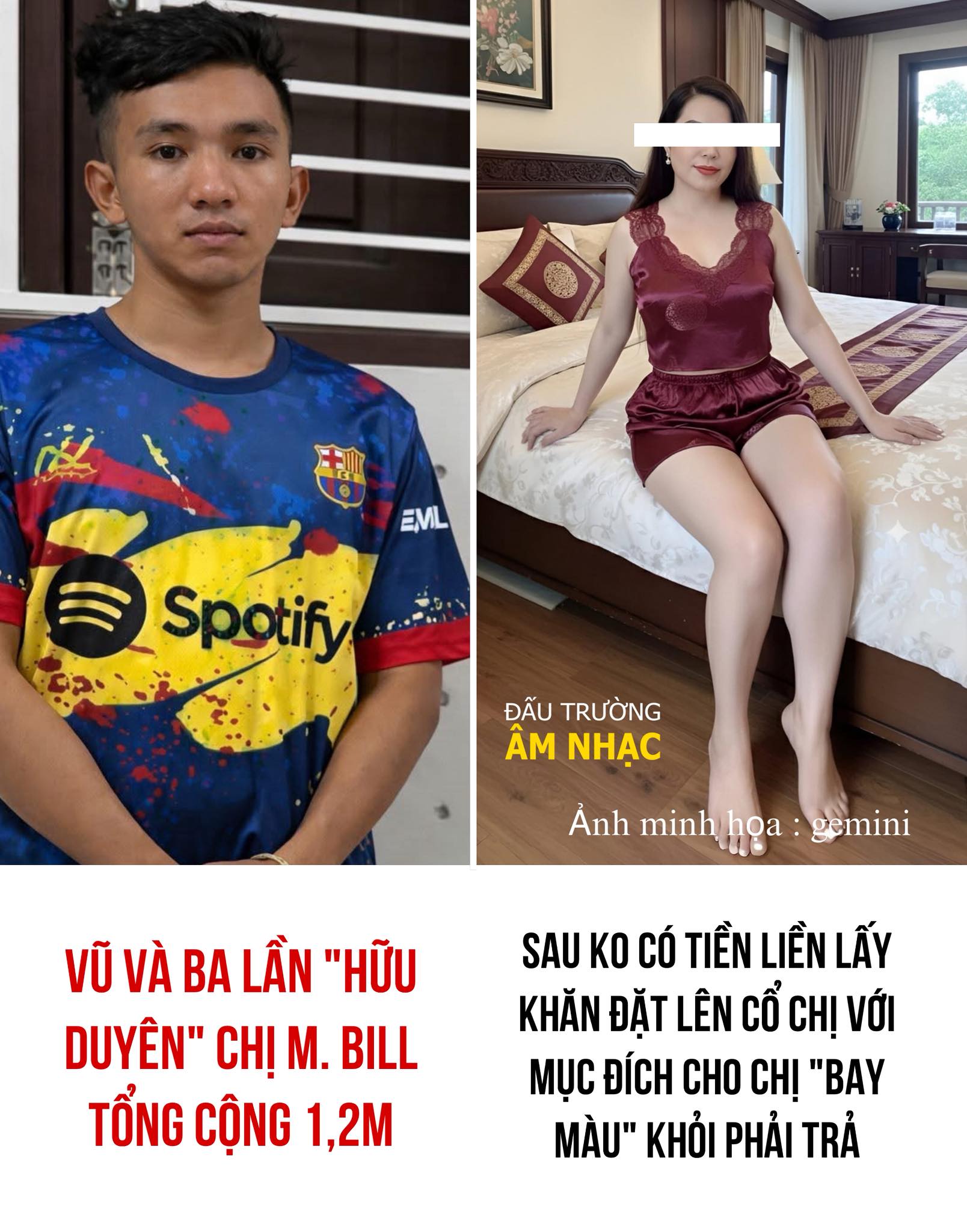 Lúc này “tình cảm” đôi bên vẫn còn mặn nồng lắm, chị M. cứ tưởng gặp được “tổng tài”, ai dè đâu Vũ chỉ mạnh ở “thể lực” còn “tài lực” thì trống không. Xong việc, Vũ nhìn cái bill 1,2 triệu cho 3 lần “hữu duyên” mà túi tiền thì “héo úa” như bông mười giờ lúc 12 giờ trưa, Vũ bắt đầu bật mode “diễn viên”. Vũ giả vờ nói với chị M. ra quầy xin pass wifi để chuyển khoản, nhưng khi chị M.